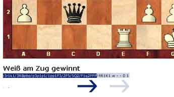 Eine elegante Möglichkeit, die Stellungen schnell und fehlerfrei in ein Schachprogramm (z.B. FRITZ, ChessBase) zu übertragen, besteht. Unter jedem Diagramm findet man zu diesem Zweck eine sog. FEN-Zeile. Dabei handelt es sich um eine standardisierte textuelle Codierung von Schachpositionen. Die Schrift der FEN ist sehr klein gehalten, weil sich nicht vom Leser, sondern vom jeweiligen Schachprogramm, das man benutzen will, eingelesen werden soll.